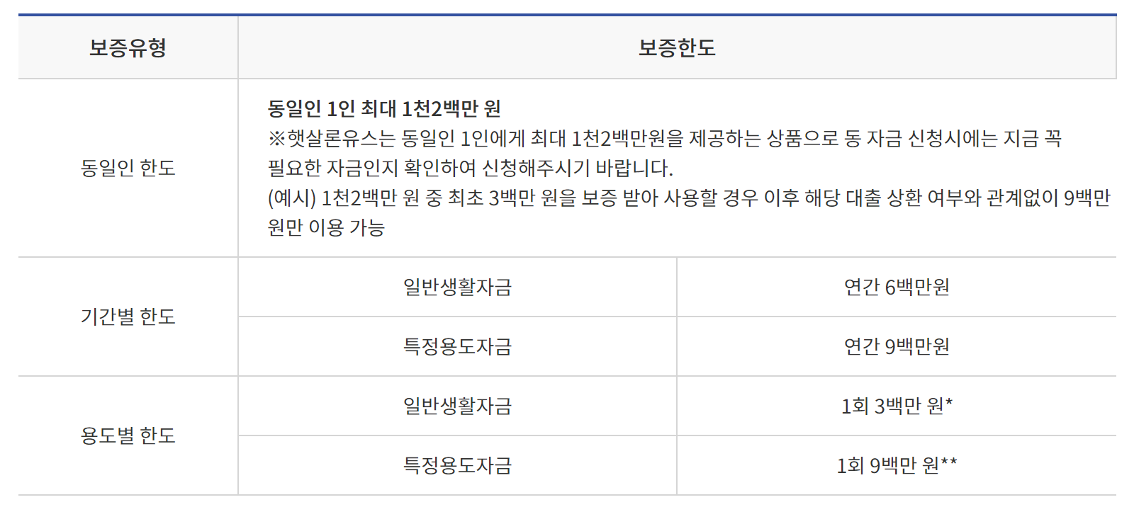 예) 2021.4.3 특례보증으로 5백만 원 이용 시, 소요기간 6개월(=5백만 원/월 85만 원)이 지난 2021.10. 4. 이후 일반생활자금은 최대 3백만 원, 특정용도자금은 최대 7백만 원 신청가능합니다. (특례보증 자금은 연간 한도에서 제외)