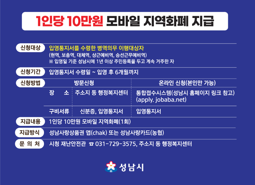 ※ 단, 군대 입대일기준 성남시에 1년 이상 주민등록을 두고 계속 거주한 분이어야 합니다.