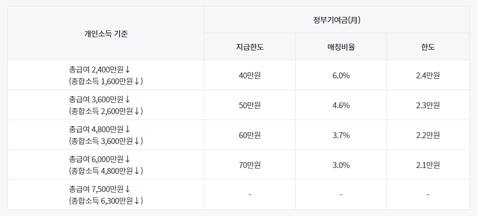 - 납입한 금액에 비례해 소득구간별 정부기여금을 지원합니다.
