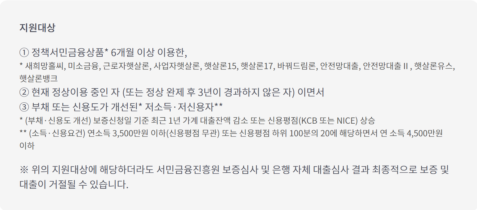 정책서민금융 성실상환자로, 부채 또는 신용도가 개선된 저신용, 저소득자가 지원대상입니다.